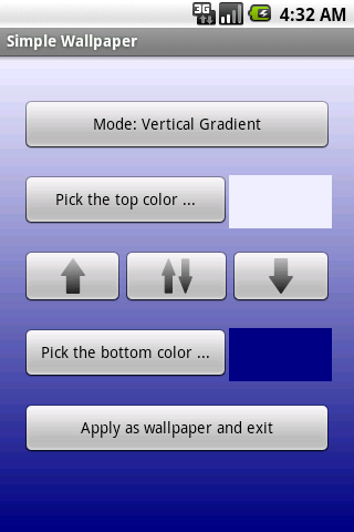 SimpleWallpaper enables you to quickly create and apply a new wallpaper as a single flat color, or as a horizontal or vertical gradient of two colors.