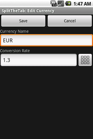For the currencies, it is recommended to use standard 3-letter codes (for example, "USD" for US dollars), and to use a conversion rate of 1.0 for your home currency.